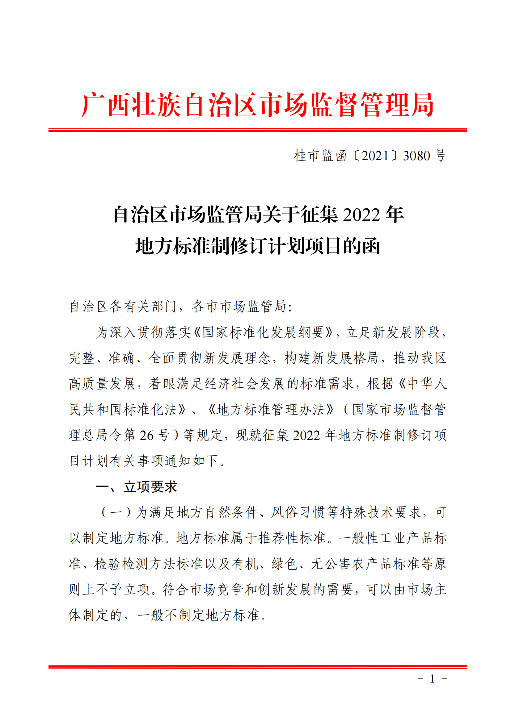 自治區(qū)市場(chǎng)監(jiān)管局關(guān)于征集2022年地方標(biāo)準(zhǔn)制修訂計(jì)劃項(xiàng)目的函
